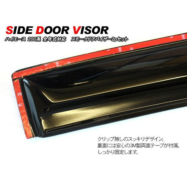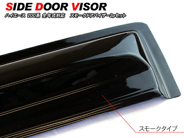 【ハイエース 200系パーツ】ドアバイザー/サイドバイザー スモーク仕様 全年式対応 フロント2枚セット商品説明 【適合車種】200系ハイエース/レジアスエース200系(KDH200/TRH200系) 標準/ワイドボディ 全年式対応 5型(H29.12〜) ※DX/スーパーGL対応 ・ハイエース200 系 に対応するサイドドアバイザー1台分セットです。